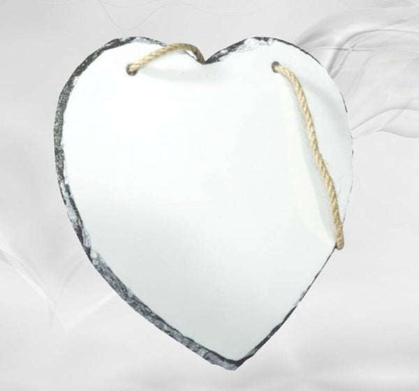 Our natural heart-shaped rock slate features a sleek white polymer-coated surface, ideal for creating stunning and personalised designs through dye sublimation printing. Please note that these photo slates are made from a natural material, which means each piece is unique and may display natural characteristics such as black spots, blemishes, dips, and bumps. These imperfections add to the slate's charm and authenticity, making it a perfect choice for memorable gifts or decorative purposes.