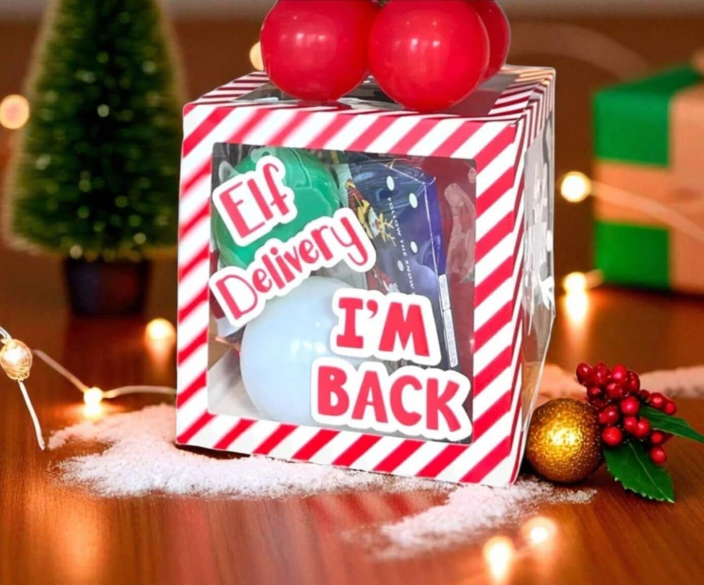 Get ready to make your elf's arrival extra special with our beautifully designed Elf Arrival Box. Featuring charming wording, including "I'm Back" and "Elf Delivery", along with a delicate snowflake design, this box sets the perfect tone for festive fun. Please note, contents such as the elf, balloons, and bows are not included. With a spacious size of 30x30x30cm, it’s ideal for creating a magical and memorable moment your family will cherish. Bring the festive spirit to life with this enchanting addition to your Christmas celebrations!
