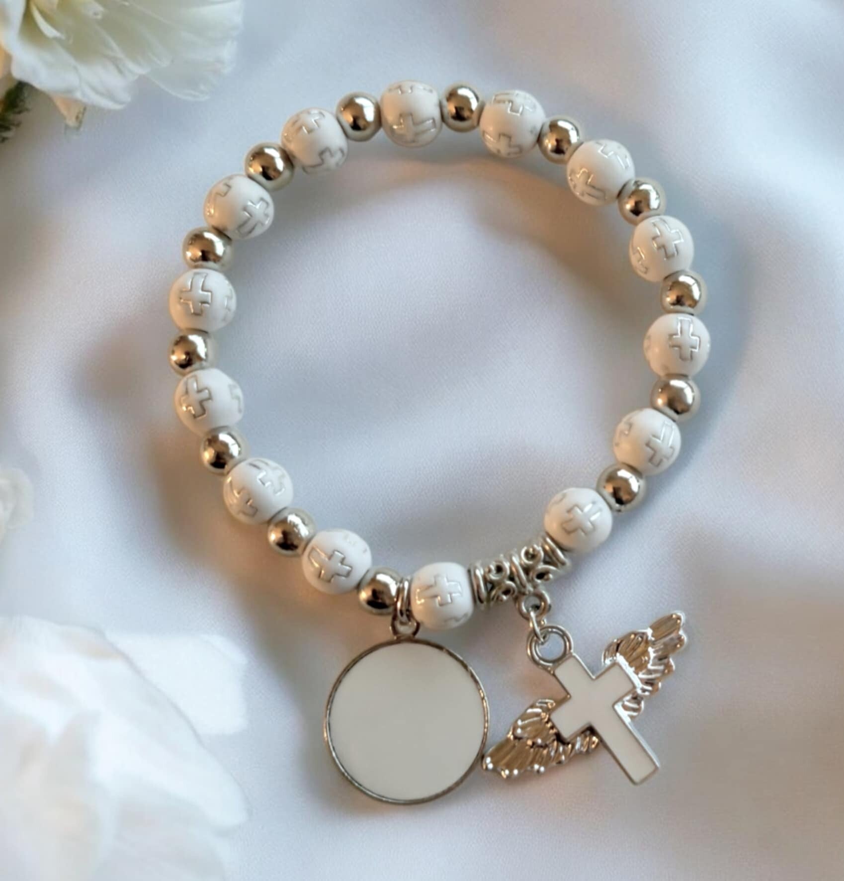This stunning faux pearl bracelet features a round sublimation charm and intricate cross details on the beads, it combines timeless elegance with a touch of spiritual symbolism. The included cross charm adds a delicate highlight, making it a meaningful gift or a versatile addition to your jewellery collection. Whether for casual wear or a special occasion, this bracelet promises to enhance your style effortlessly.