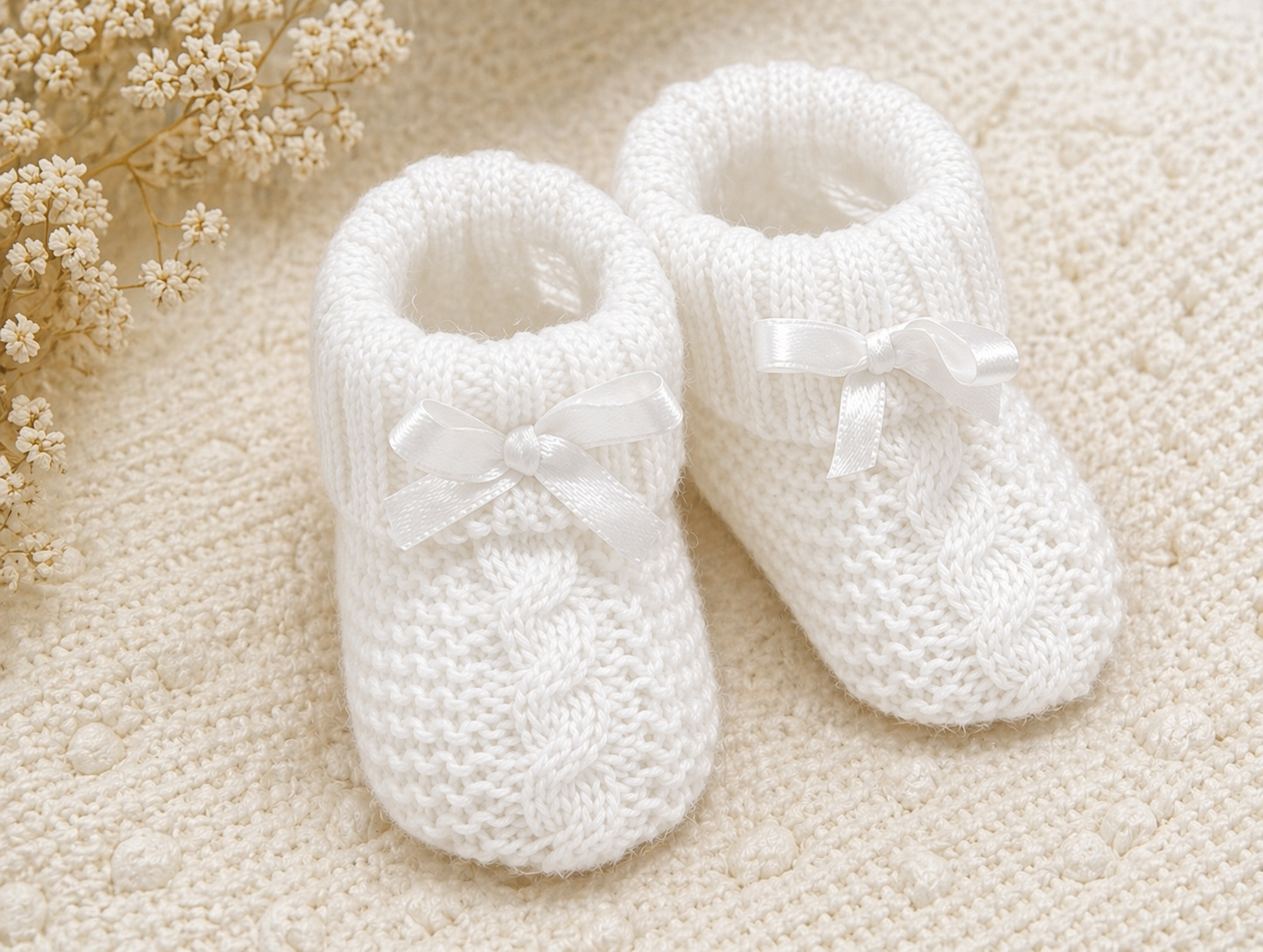 Keep tiny toes cozy and picture-perfect with our Knitted Baby Bootees With Bow in classic white. Designed for newborns up to 3 months, these beautifully soft booties feature a delicate knit texture and a charming satin bow for an elegant finishing touch. Gentle on delicate skin and easy to slip on, they’re ideal for everyday wear, special occasions, or personalisation. A timeless essential for any baby collection, perfect for gifting or retail at Shamrock Wholesale Blanks.